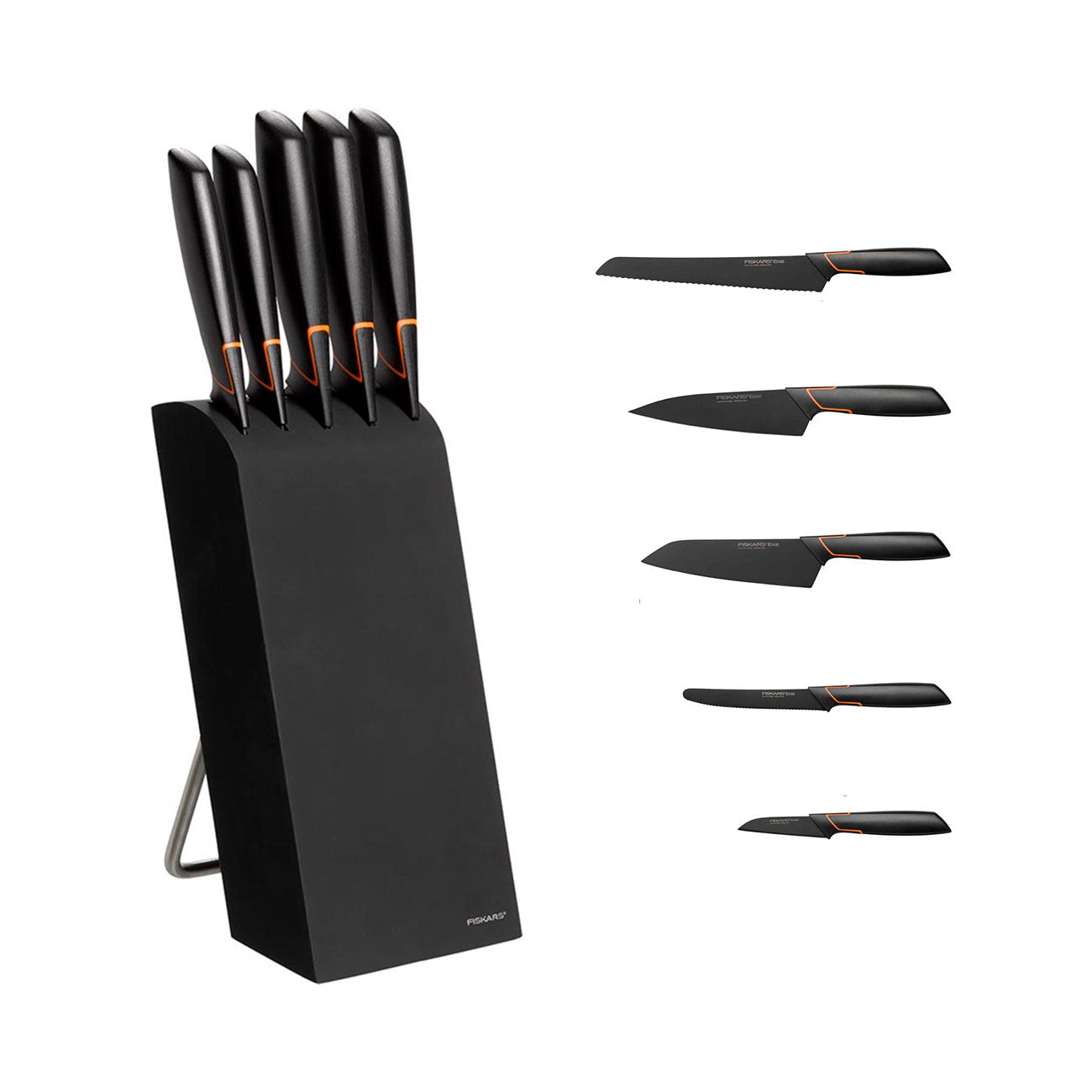 Laadukas Fiskars Edge veitsisetti, johon sisältyy veitsiteline ja 5 viisi erilaista veistä: leipäveitsi, iso kokinveitsi, santoku-veitsi, tomaattiveitsi ja kuorimaveitsi. Veitsien terät ovat valmistettu korkealaatuisesta japanilaisesta ruostumattomasta teräksestä. Kahva on muovia, josta saa hyvän otteen. Veitsitelineen voi kiinnittää seinään, asettaa keittiötasolle tai kaappiin. Veitset ovat konepesun kestäviä. Suunniteltu Suomessa.