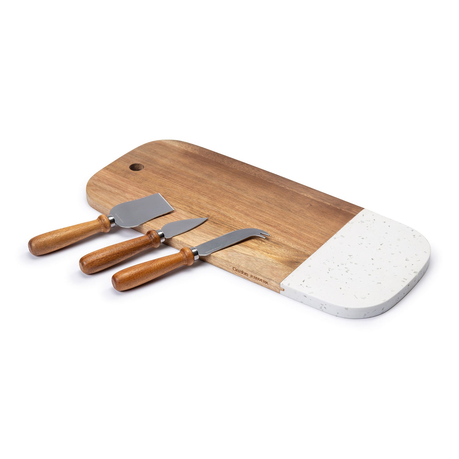 Orrefors Jernverk juustoveitsisetti tarjottimella. Settiin sisältyy 3 kpl juustoveistä ja puinen tarjotin. Toimitetaan lahjapakkauksessa. Juustoveisten terät ovat ruostumatonta terästä ja kahvat puuta. Tarjotin on valmistettu akaasiapuusta ja terrazzo-kivestä. Meiltä voit tilata juustoveitsisetit omalla logolla, kaiverruksella. Ota yhteyttä / Kysy lisätietoja / Pyydä tarjous!