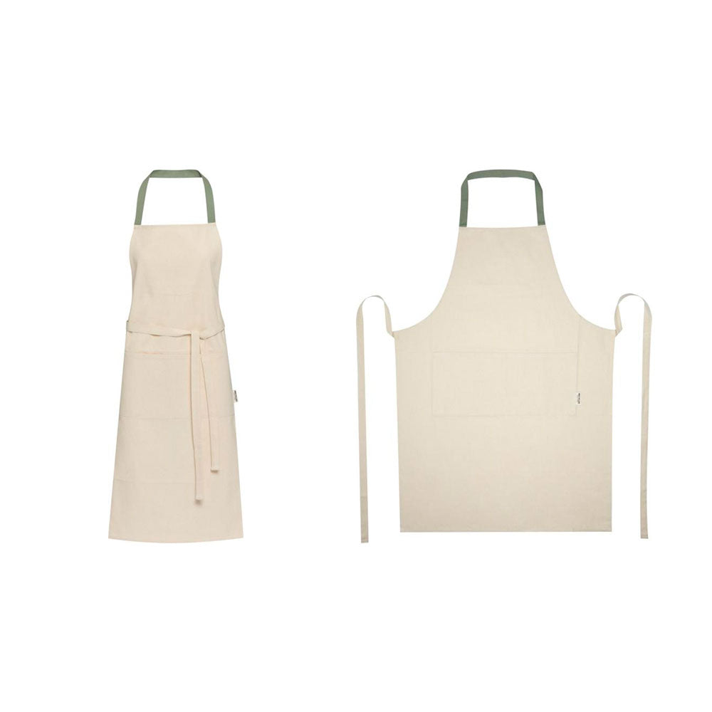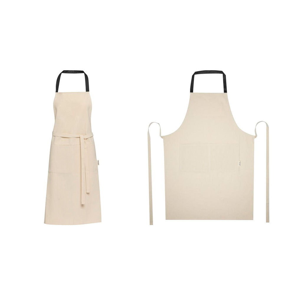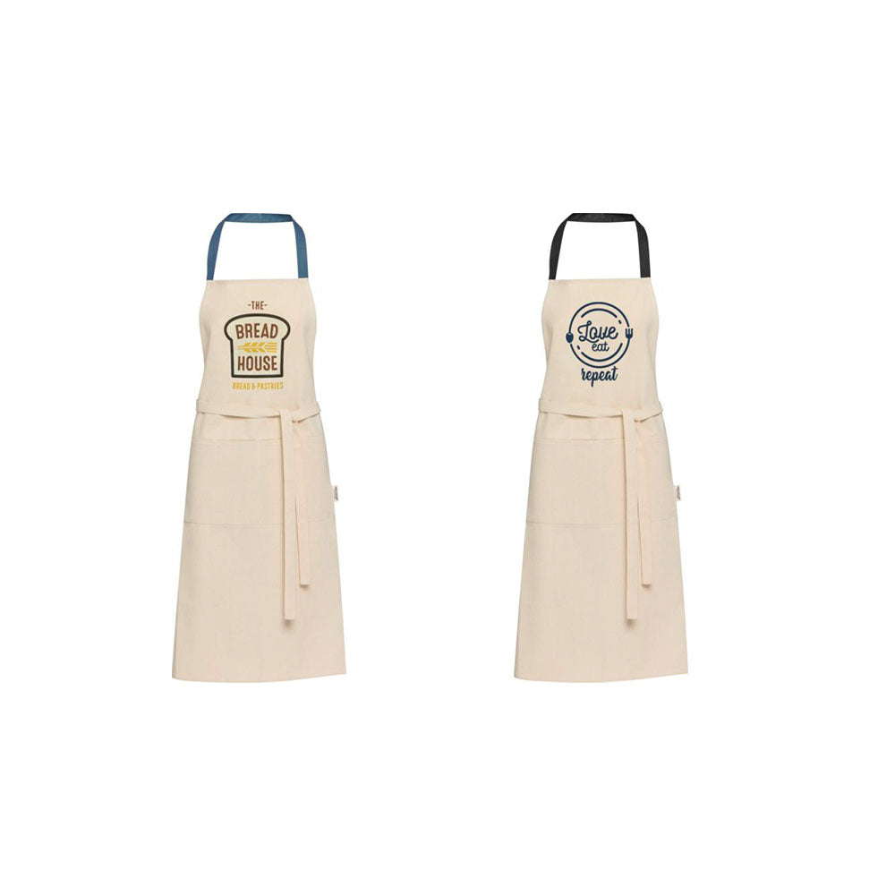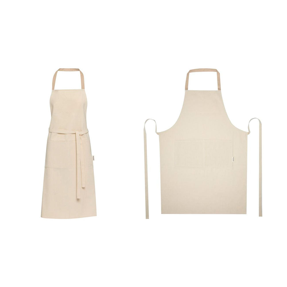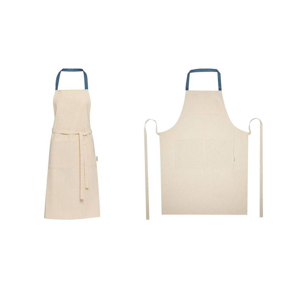 Luonnonvalkoinen esiliina kierrätyspuuvillasta (200 g/m2). Esiliinan niskan yli menevä nauha on kontrasivärinen. Esiliinassa on kaksi taskua. Tilaa esiliinat omalla painatuksella tai brodeerauksella, esimerkiksi logolla. Pyydä tarjous!